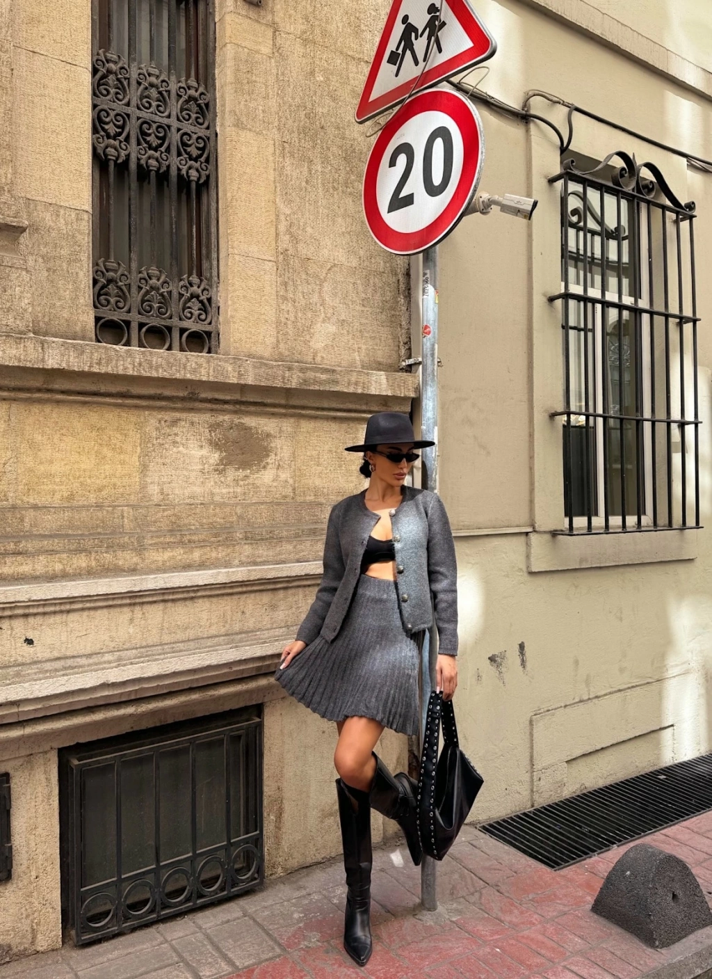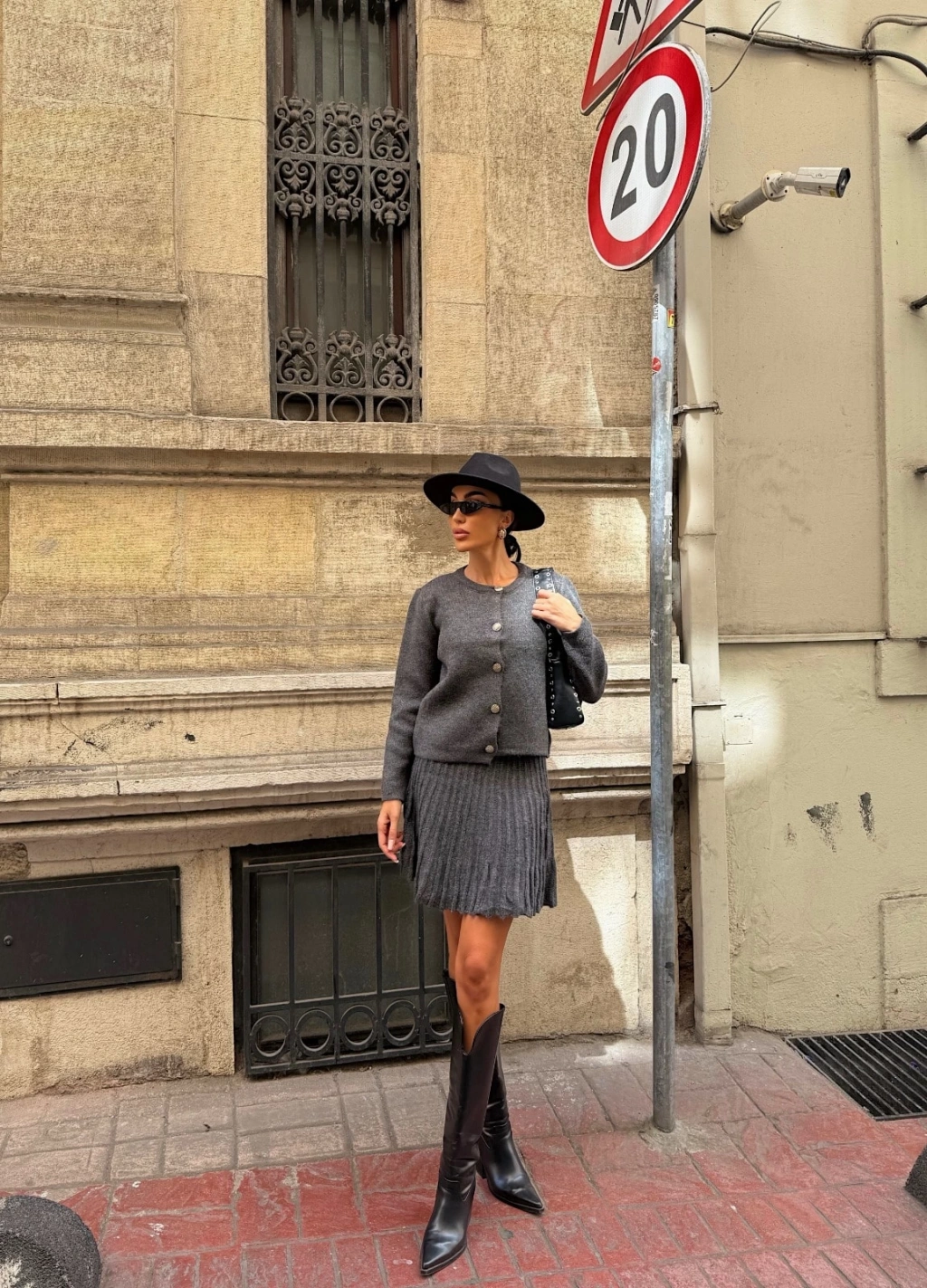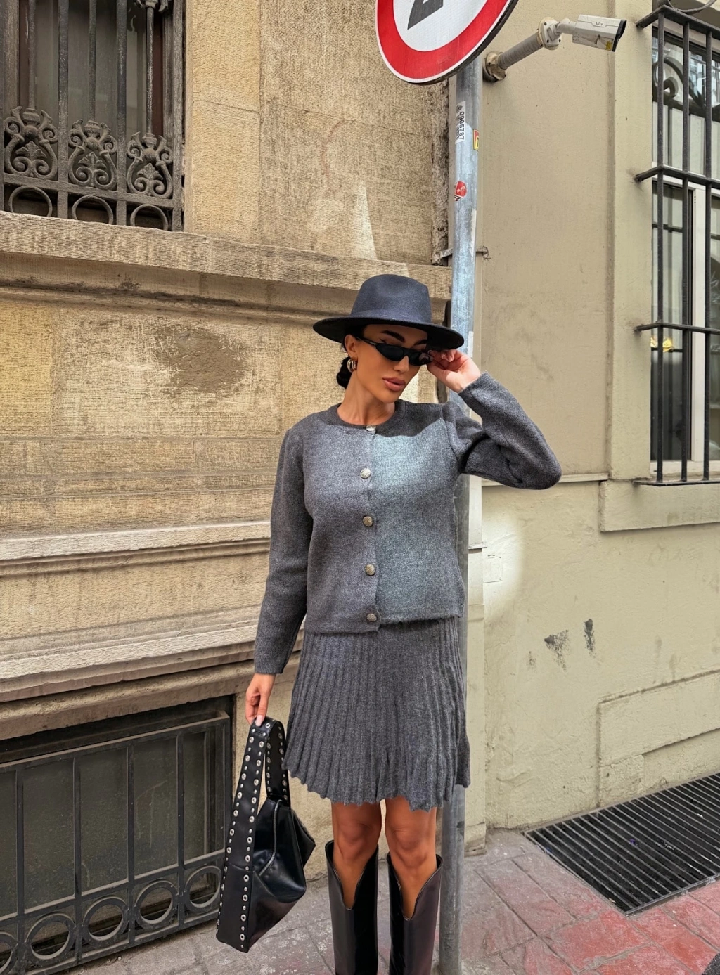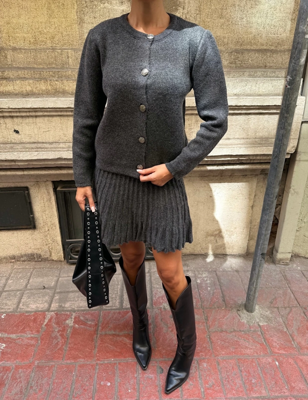 Bisiklet Yaka Hırka Ve Pile Detaylı Etek Triko Takım